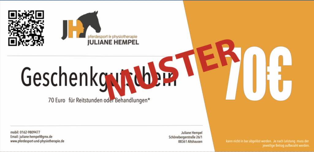 Erstuntersuchung und Behandlung mit Ganganalyse, Sattel und Trensencheck. Folgeuntersuchung ist nach ca 4 Wochen empfehlenswert um eventuelle sekundäre Blockaden zu behandeln bzw. zu lösen.